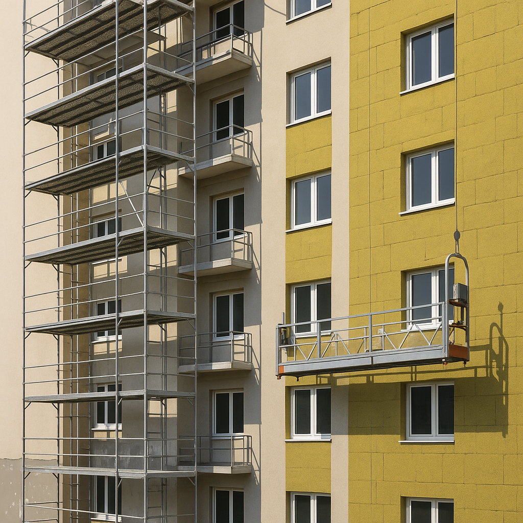 Állványozásos kivitelezés – nagy felületekhez, társasházaknál, középületeknél ideális; biztonságos munkavégzés nagy teherbírású rendszerekkel.