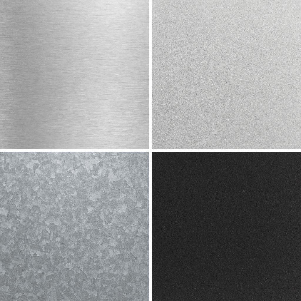Anyag- és felületválaszték: szénacél, rozsdamentes (INOX), alumínium; tüzihorganyzás, porfestés, kefélt/matt INOX.
