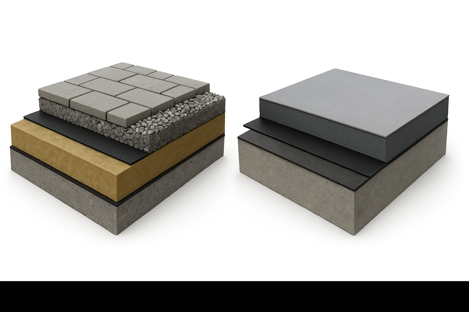 Lejtésképzés → vízszigetelés → XPS hőszigetelés → geotextil → leterhelés (kavics, járólap, zöldtető).